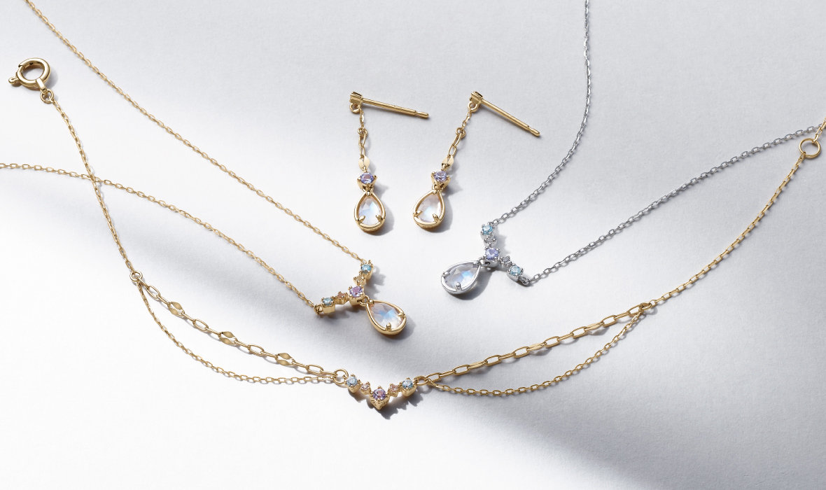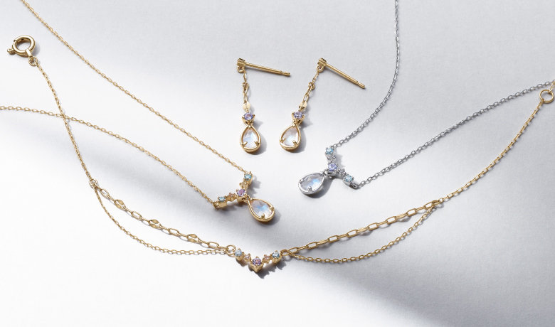 月の光を受けてほのかにきらめく、しずくのような輝きをまとったカラーストーンジュエリー。