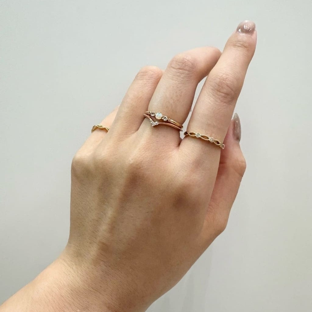 オパールのあたたかい輝き方に合わせて、V字のリングはピンクゴールドのアイテムを合わせてみました🍀