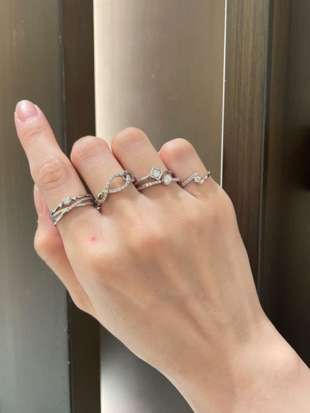 中指や小指に動きのあるアシンメトリーデザインを身に着けて、メリハリをつけたのがポイント💡