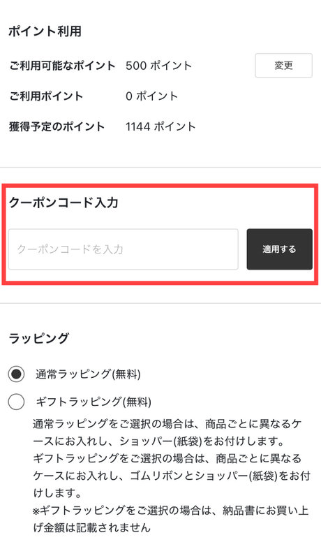 注文内容の確認画面にて、クーポンコードを入力して「適用する」ボタンを入力してください。