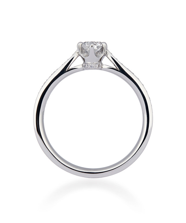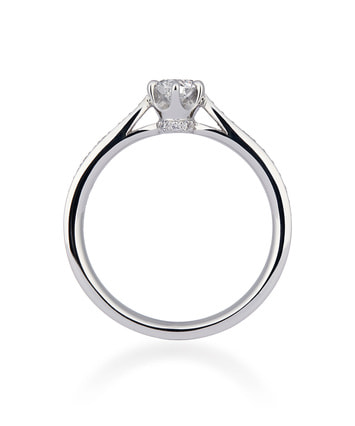 メインのダイヤモンドを輝く王冠の石枠でかかげる上品なエンゲージリングです。