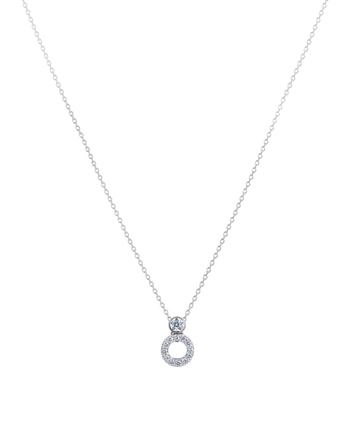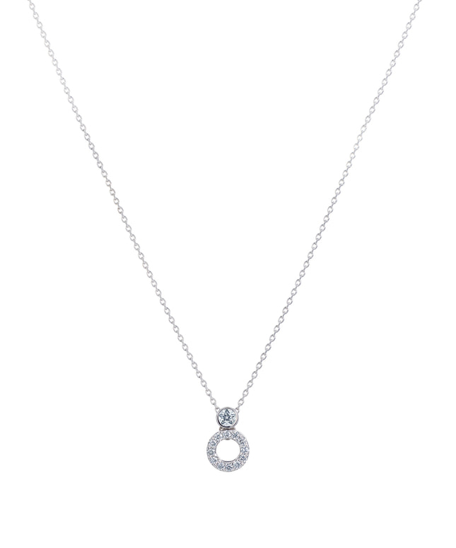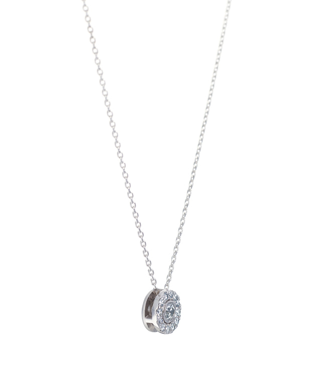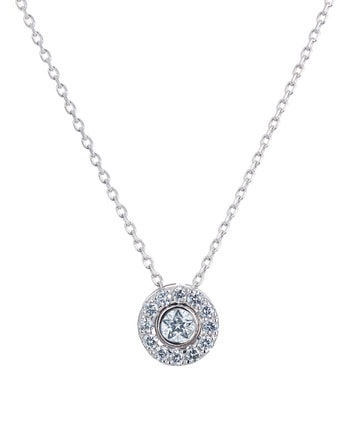 フェスタリアのオリジナルプレミアムカット “Wish upon a star®” ダイヤモンドをメインに、繊細なメレダイヤモンドで取り巻いた、どんな装いにも合わせやすいネックレス。
