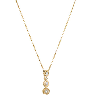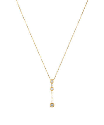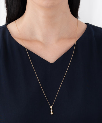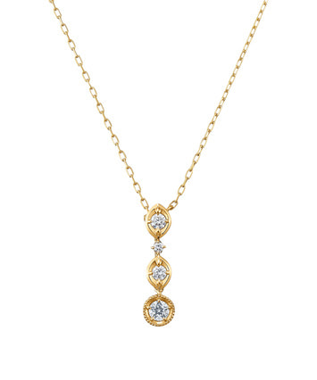 3石のダイヤモンドで「過去・現在・未来」を表現した、王道のスリーストーンネックレス。モノトーンカラーに映えるゴールドのロングネックレスで華やかさを演出。トップ先端のダイヤモンドをスライドすることで現れるY字シルエットが、胸元に輝きのアクセントとすっきりとした上品な印象をプラスします。トップ先端にはふたつの星が映し出される "Wish upon a star®” ダイヤモンドをセッティング。ダイヤモンドにきらめく小さな星は「今」の自分、大きな星は輝く「未来」の自分と愛する人たちの象徴です。■"Wish upon a star®" ダイヤモンドについてはこちら※留め金付近に女性のお守り石でもあるルビーをセッティングしています。■長さの調節ができるアジャスターはこちら※全国のフェスタリア系列店舗にてクリーニングやアフターメンテナンスを承ります。