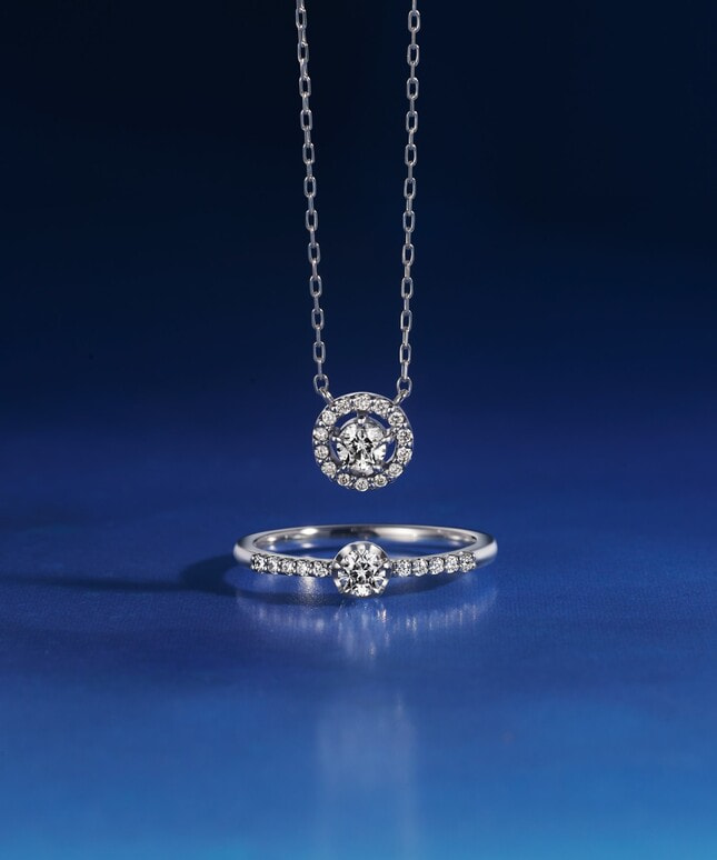 その “Wish upon a star®” ダイヤモンドを囲む細やかなメレダイヤモンドは、北極星の周りを時と共に回転する「星空」を思わせます。