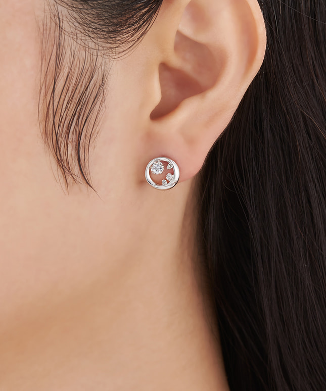 三日月が刻一刻と満月へと満ちていく、その時の流れを表現したシリーズ。艶やかに磨かれたサークルに若干のひねりを加え、ラインに強弱をつけた動きのあるフォルムで夜空に輝く満月を表現したピアス。柔らかくピュアな輝きが、上品で優しい雰囲気をプラスします。満月に寄り添うように繊細な輝きを放つ1石には、ふたつの星が映し出されるキュービックジルコニアをセッティングすることで、月と星の共演を楽しんでいただけます。繊細なきらめきをまといながら横顔を明るく彩るピアスは、スタイルを選ばずお使いいただける色合いとデザインで、デイリーユースにもピッタリです。■同シリーズのアイテムはこちら※全国のフェスタリア系列店舗にてクリーニングやアフターメンテナンスを承ります。