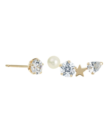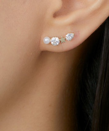 夢を叶える、ふたつの星を映し出すキュービックジルコニアをあしらったピアス。小さな星は「今」の自分、大きな星は輝く「未来」の自分と愛する人たちの象徴です。一粒ピアスとラインピアスの、アシンメトリーなデザイン。使いやすいデザインでありながら遊び心のあるアイテムです。■様々なタイプのキャッチをご用意しております。ラインナップはこちら※全国のフェスタリア系列店舗にてクリーニングやアフターメンテナンスを承ります。#ピアス K10 #ピアス キュービックジルコニア #ピアス 淡水パール #星モチーフ #アシンメトリーピアス