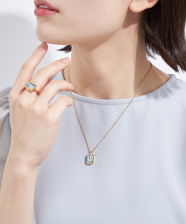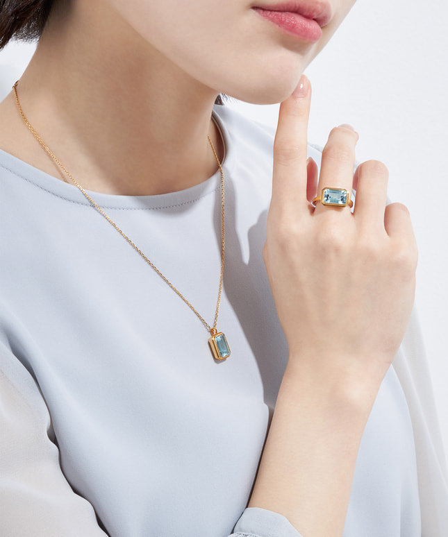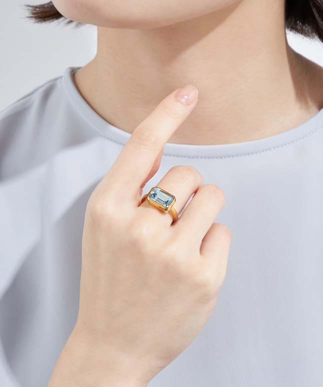 空のように明るいスカイブルートパーズを、ゴールドカラーのフレームが縁取り、リラックススタイルに華やかなつやめきをプラスします。