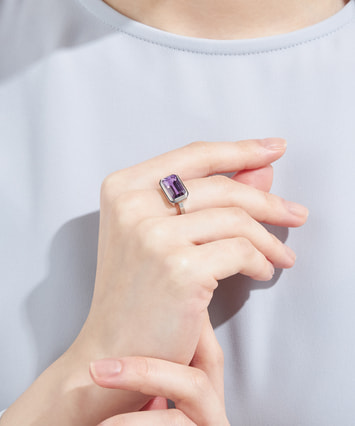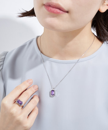 上品な色合いに透明感が際立つライトアメシストをプラチナカラーのフレームが縁取り、リラックススタイルに華やかなつやめきをプラスします。