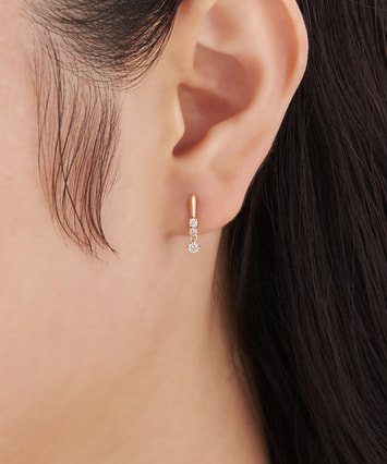 明けつつある闇の中でキラキラと光が降りそそぎ、その光が積み重なる様をイメージしたピアス。身につける方の大切な瞬間が輝きに彩られますように、とデザイナーの願いが込められています。ダイヤモンドを縦にセッティングすることで生まれるすっきりとしたフォルムはダイヤモンドの繊細なきらめきを楽しんでいただけ、ゴールドの柔らかい色調とあいまって普段の装いにアクセントをプラスします。■様々なタイプのキャッチをご用意しております。ラインナップはこちら