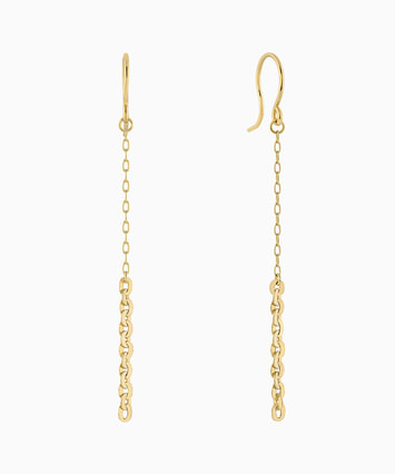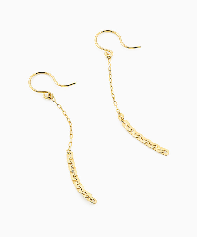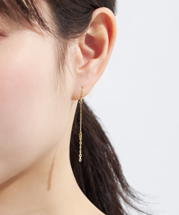 メタルの輝きが美しいデザインチェーンのピアス。フラットなフォルムのフレスコチェーンをあしらい、シンプルながらもモダンでスタイリッシュな印象に仕上げました。揺れ感を楽しめる長さで、光を受けるたびお顔まわりに華やかに彩ります。シャツやデニムなどのカジュアルな装いにも相性がよく、デイリーに活躍するアイテムです。■同シリーズのアイテムはこちら■様々なタイプのキャッチをご用意しております。ラインナップはこちら※全国のフェスタリア系列店舗にてクリーニングやアフターメンテナンスを承ります。