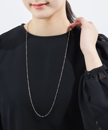 メタルの輝きが美しいデザインチェーンのロングネックレス。