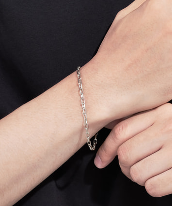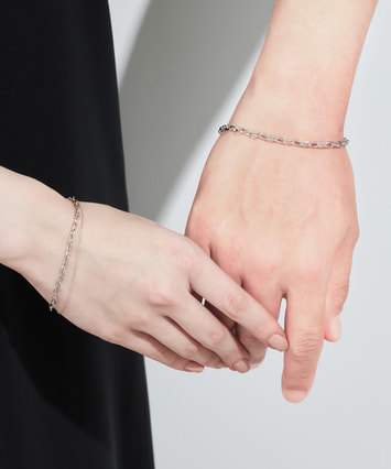 ボリュームのあるシルバーチェーンのブレスレット。通常よりも厚みがあるコーティングのため、肌に吸い付くような滑らかな付け心地で、着けるたびに風合いを増しながら、プラチナの優美な輝きをより長くお楽しみいただけます。※全国のフェスタリア系列店舗にてクリーニングやアフターメンテナンスを承ります。 ■ペアのブレスレットはこちら ■ペアジュエリーのラインナップはこちら