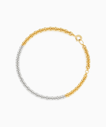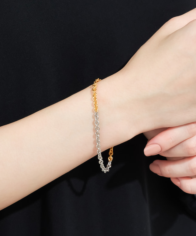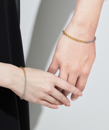 ゴールドカラーとプラチナカラーの2色使いで、お持ちのジュエリーとコーディネートしやすいブレスレット。通常よりも厚みがあるコーティングのため、肌に吸い付くような滑らかな付け心地で、着けるたびに風合いを増しながら、ゴールドやプラチナの優美な輝きをより長くお楽しみいただけます。※全国のフェスタリア系列店舗にてクリーニングやアフターメンテナンスを承ります。 ■ペアのブレスレットはこちら ■ペアジュエリーのラインナップはこちら