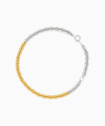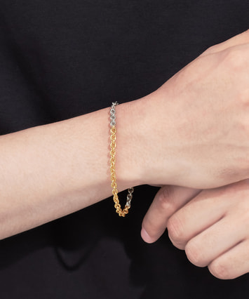 ゴールドカラーとプラチナカラーの2色使いで、お持ちのジュエリーとコーディネートしやすいブレスレット。通常よりも厚みがあるコーティングのため、肌に吸い付くような滑らかな付け心地で、着けるたびに風合いを増しながら、ゴールドやプラチナの優美な輝きをより長くお楽しみいただけます。※全国のフェスタリア系列店舗にてクリーニングやアフターメンテナンスを承ります。 ■ペアのブレスレットはこちら ■ペアジュエリーのラインナップはこちら