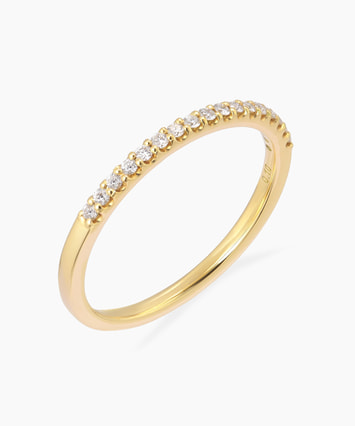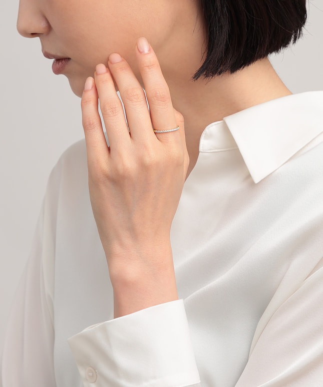 永遠のベーシックデザインとして人気のハーフエタニティリング。ダイヤモンドの存在感を際立たせるためのセッティングやバランスが、あらゆる角度からきらめきを引き立たせ豊かな表情を生み出します。地金部分は裏抜きをしないことで、指に馴染むなめらかな着け心地を実現。計算された幅や厚みのバランスは変形にも強く、長く愛用できる仕立てに。洗練されたフォルムは、他のリングとの重ねづけも相性抜群です。ダイヤモンドはHカラー、SIクラスのクラリティ、Goodカット以上の品質の中から厳選したもののみを使用。さらにその輝きを最大限に引き立たせる極小の爪にこだわり、究極のベーシックデザインだからこそ輝きの美しさを追及しました。一切の妥協を許さないその仕上がりと品質は、年齢やオケージョンを問わず時を超えて愛せる逸品です。■同デザインの7~14号はこちら■同シリーズのアイテムはこちら、