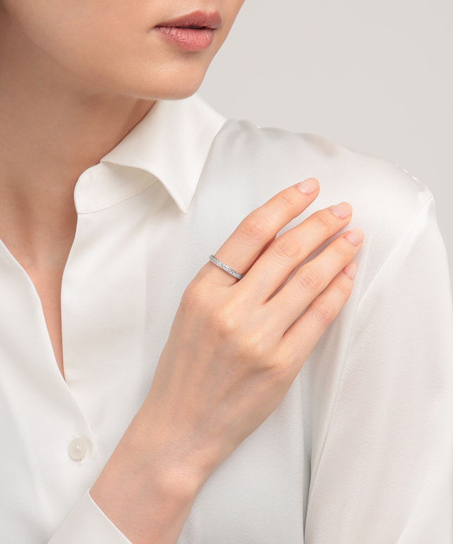 永遠のベーシックデザインとして人気のハーフエタニティリング。ダイヤモンドの存在感を際立たせるためのセッティングやバランスが、あらゆる角度からきらめきを引き立たせ豊かな表情を生み出します。地金部分は裏抜きをしないことで、指に馴染むなめらかな着け心地を実現。計算された幅や厚みのバランスは変形にも強く、長く愛用できる仕立てに。洗練されたフォルムは、他のリングとの重ねづけも相性抜群です。ダイヤモンドはHカラー、SIクラスのクラリティ、Goodカット以上の品質の中から厳選したもののみを使用。さらにその輝きを最大限に引き立たせる極小の爪にこだわり、究極のベーシックデザインだからこそ輝きの美しさを追及しました。一切の妥協を許さないその仕上がりと品質は、年齢やオケージョンを問わず時を超えて愛せる逸品です。■同デザインの7~14号はこちら■同シリーズのアイテムはこちら、