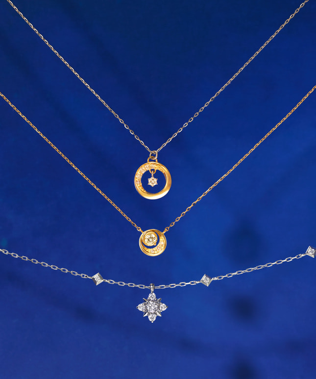 仕草にあわせて絶えずきらめくダイヤモンドが、印象的に胸元を照らし続けます。