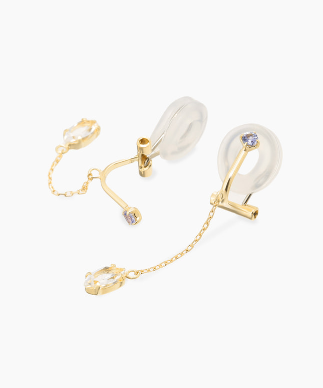 上品でクリアな輝きが美しいホワイトトパーズとタンザナイト。仕草にあわせて揺れる度、顔まわりに華やかさをプラス。シンプルなデザインながら、タンザナイトの味わい深いカラーが上品なムードを放ちます。圧迫感を感じにくいシリコンパーツのため、デイリーに身に着けやすいのも嬉しいポイント。カジュアルからオフィスまで、どんなシーンでもお楽しみいただけます。※天然石を使用しているため、ストーンの色合いは一つ一つ異なる場合がございます。※全国のフェスタリア系列店舗にてクリーニングやアフターメンテナンスを承ります。#イヤリング クリップタイプ #揺れるイヤリング #12月誕生石 タンザナイト