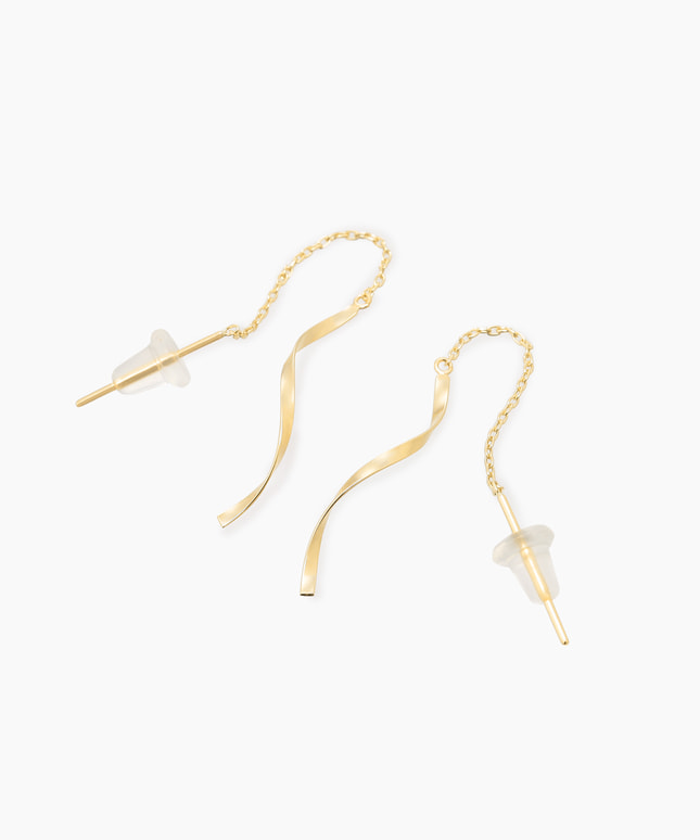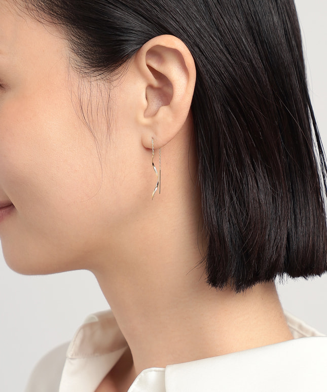 モダンな印象のピアス。ゆるやかにカーブを描くゴールドがきらめくたび、顔まわりを印象的に彩ります。付属のキャッチで長さを調整できるのも嬉しいポイント。気分や装い、ヘアスタイルに合わせてアレンジをお楽しみいただけます。※全国のフェスタリア系列店舗にてクリーニングやアフターメンテナンスを承ります。