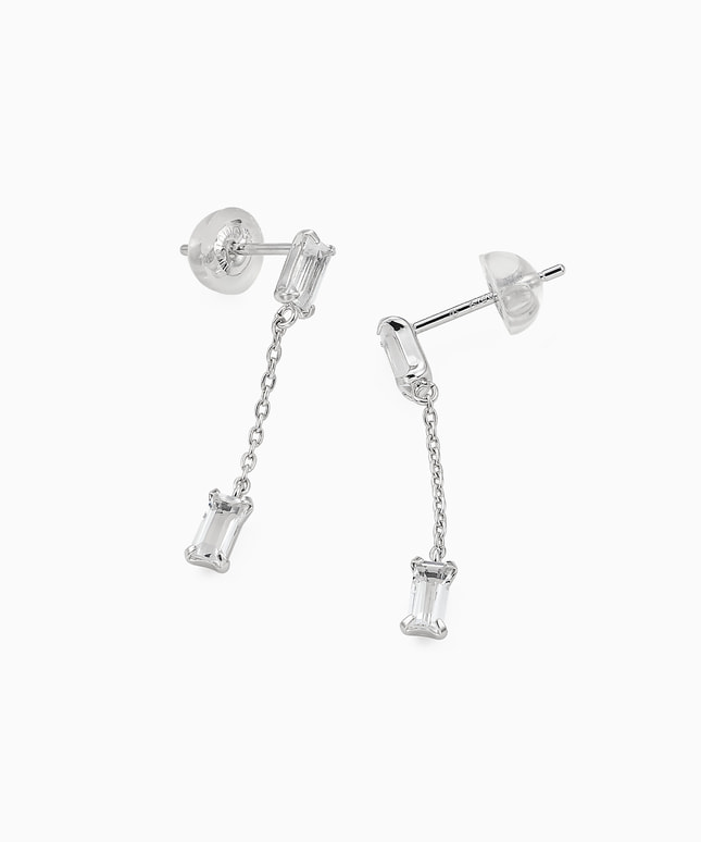 シャープな輝きを放つバゲットカットのホワイトトパーズを、スタッドとチェーンの先にあしらったモダンなピアス。耳元で揺れるたびに、洗練された光が顔周りを華やかに彩ります。シンプルなデザインながらも存在感があり、オフィスからカジュアル、フォーマルまで幅広いシーンで活躍します。■様々なタイプのキャッチをご用意しております。ラインナップはこちら※天然石を使用しているため、ストーンの色や柄は一つ一つ異なる場合がございます。※全国のフェスタリア系列店舗にてクリーニングやアフターメンテナンスを承ります。