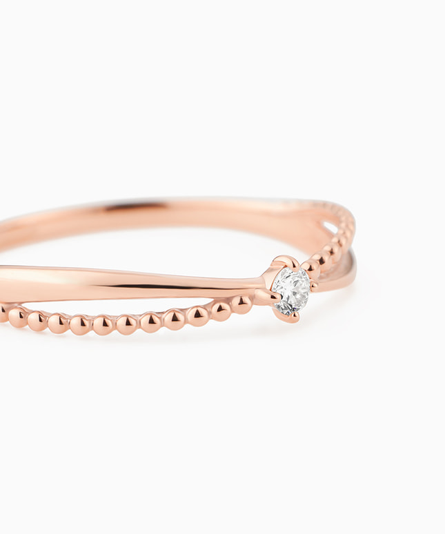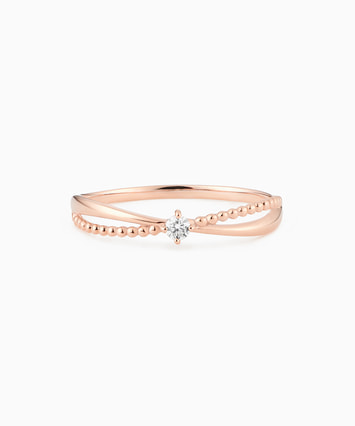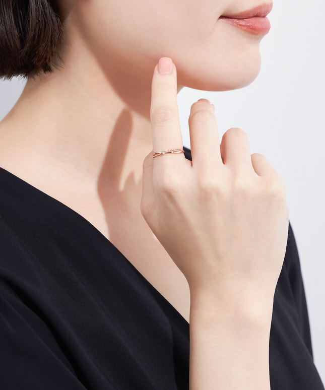 交差するクロスの中央にダイヤモンドが輝くリング。一方のラインは「身に着ける方の幸せがずっと続いていくように…」という願いが込められているといわれるミル打ちのデザイン。ピンクゴールドは肌なじみの良いカラーで、服装やシーンを選ばず活躍します。デイリーに身に着けられるリングは、贈り物にもおすすめです。※全国のフェスタリア系列店舗にてクリーニングやアフターメンテナンスを承ります。
