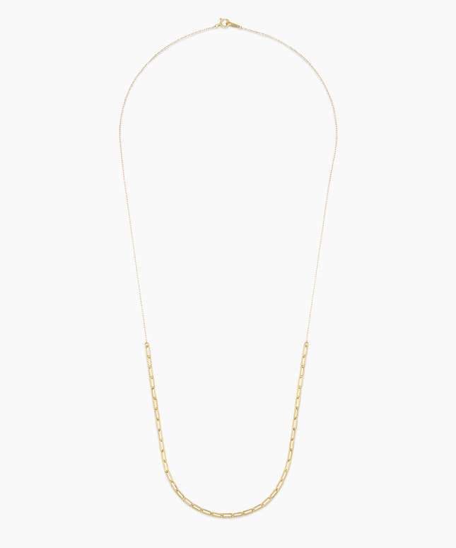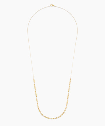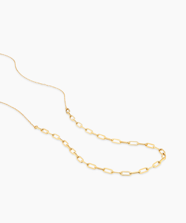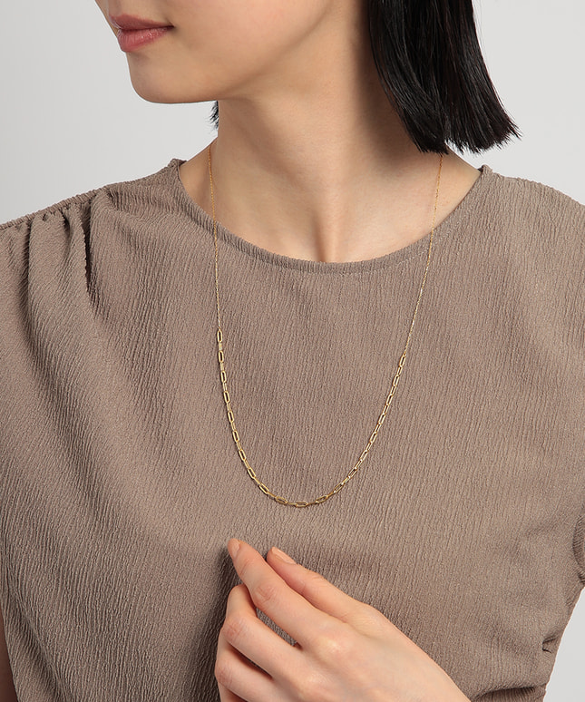 美しい光沢感のある地金チェーンネックレス。中央にはモダンかつスタイリッシュなペーパークリップチェーンをあしらい、華やかな輝きをプラスしてくれます。シャツやデニムなどカジュアルな装いにも合わせやすく、普段使いにもピッタリなネックレスです。長さは60㎝とロングネックレスなため、ゆったりとした着け感で重ね着けも楽しんでいただけます。■長さの調節ができるアジャスターはこちら※全国のフェスタリア系列店舗にてクリーニングやアフターメンテナンスを承ります。