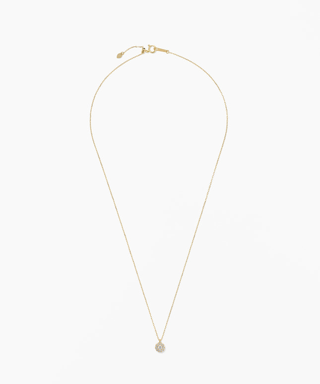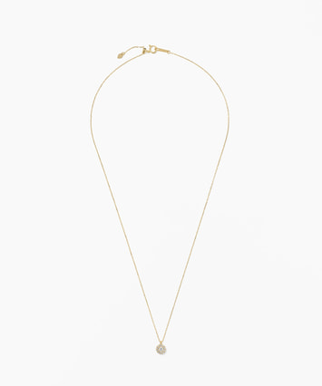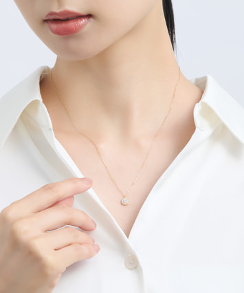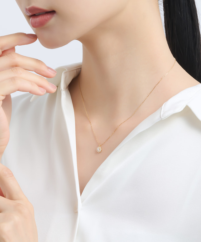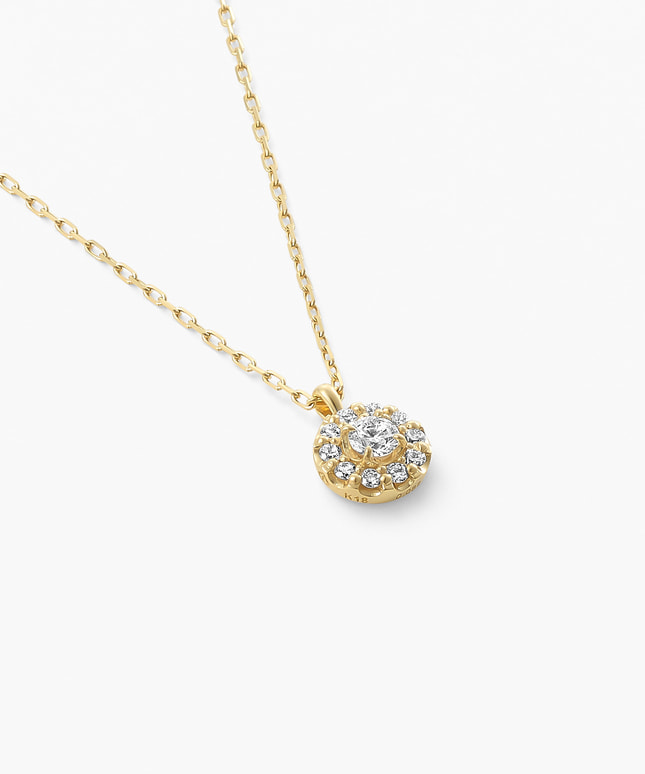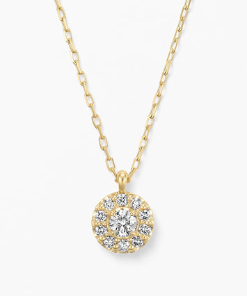 中央のダイヤモンドを小さなメレダイヤが繊細に取り囲み、胸元を華やかに彩るデザイン。