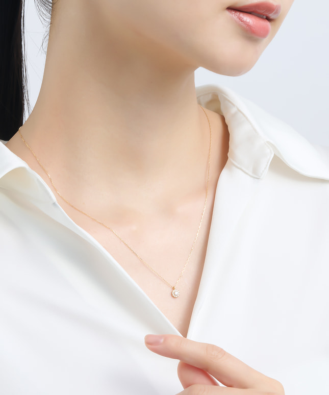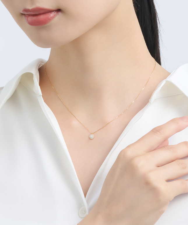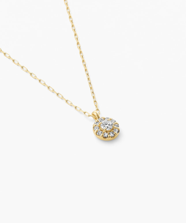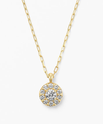 中央のダイヤモンドを小さなメレダイヤが繊細に取り囲み、胸元を華やかに彩るデザイン。