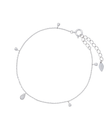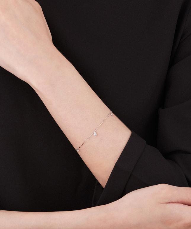ダイヤモンドをホワイトゴールドでしずく型に縁取った、繊細なモチーフのブレスレット。しずくは神様からの恵みを意味し、身に着ける女性にたくさんの幸せが降り注ぐ様をイメージ。動きに合わせてしゃらしゃらと揺れるしずくが女性らしい手元を演出します。5つのしずくにはダイヤモンドをセッティング。輝きを楽しみながら、清楚なホワイトゴールドが洗練された上品な印象をプラスします。■同シリーズのアイテムはこちら■長さの調節ができるアジャスターはこちら※全国のフェスタリア系列店舗にてクリーニングやアフターメンテナンスを承ります。