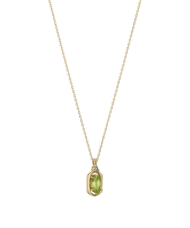 特別な記念日やお守りとして身に着けたい誕生石ジュエリー。石を包み込むように縁取られたゴールドのアウトラインはフォトフレームをイメージし、セッティングする石によってフォルムを変えデザインしたこだわりのシリーズ。艶やかなゴールドと爽やかな新緑のようなペリドットのコントラストが上品な雰囲気をプラスします。大切な人への贈り物としてもおすすめのネックレスです。■同シリーズのアイテムはこちら■長さの調節ができるアジャスターはこちら※天然石を使用しているため、ストーンの色や柄は一つ一つ異なる場合がございます。※全国のフェスタリア系列店舗にてクリーニングやアフターメンテナンスを承ります。