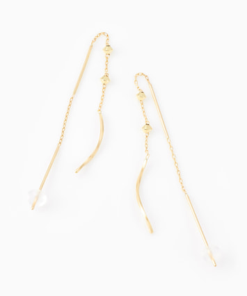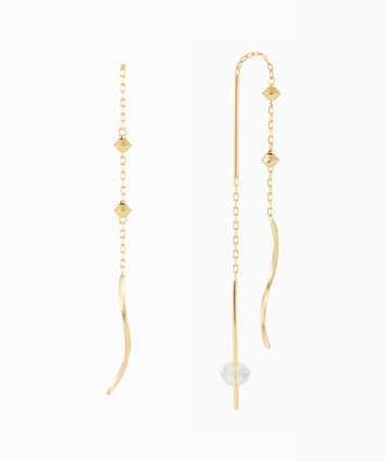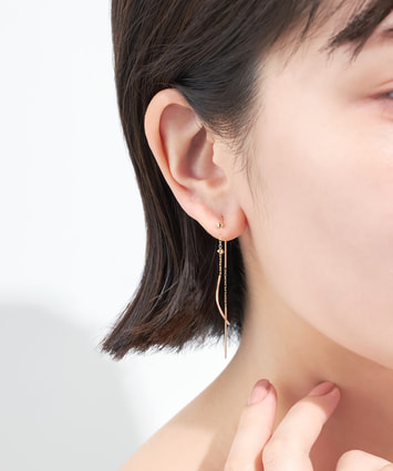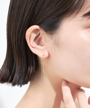 お好みの位置で身に着けられるアメリカンタイプのピアス。長さのあるデザインは、仕草にあわせて揺れる度に顔まわりに上品な華やかをプラス。繊細なチェーンにゴールドのパーツがあしらわれ、シンプルな中にもモダンなムードを感じさせます。エレガントからカジュアルまでどんなテイストにもマッチするため、日々活躍してくれるピアスです。■様々なタイプのキャッチをご用意しております。ラインナップはこちら※全国のフェスタリア系列店舗にてクリーニングやアフターメンテナンスを承ります。#地金ピアス #地金ジュエリー #アメリカンピアス #揺れるピアス #チェーンジュエリー