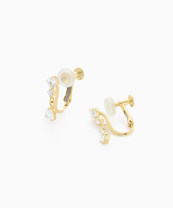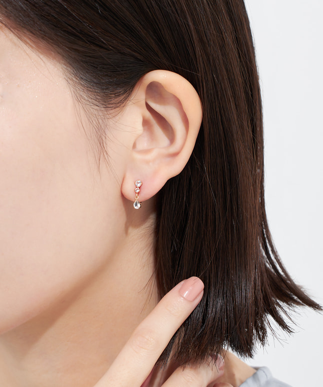 耳元をさりげなく軽やかに演出してくれるイヤリング。瑞々しい輝きを放つホワイトトパーズをあしらった、華やかな透明感が魅力です。3石のホワイトトパーズがセッティングされた正面から金具が目立ちにくいデザインで、雫型のストーンが仕草にあわせて揺れる度、横顔に華やぎをプラスします。ネジバネ式の金具なので、ご自身で着け心地の微調整が可能。普段のコーディネートを格上げしてくれるだけでなく、フォーマルなシーンにも活躍するアイテムです。■イヤリングのアイテム一覧はこちら※全国のフェスタリア系列店舗にてクリーニングやアフターメンテナンスを承ります。