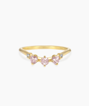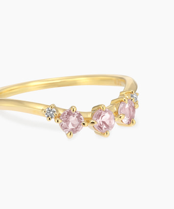 3石のモルガナイトのサイドにダイヤモンドがきらめくリング。