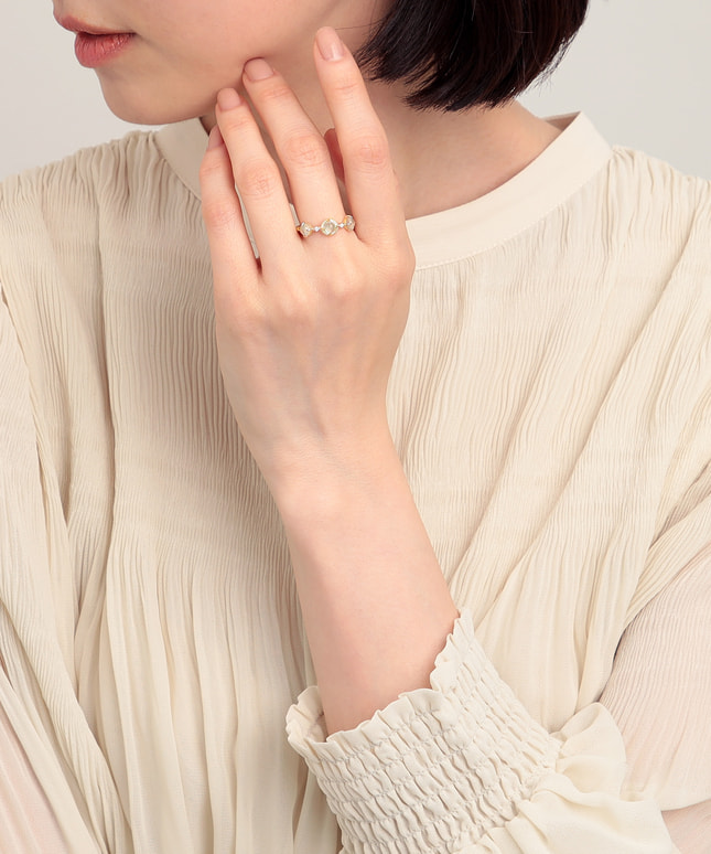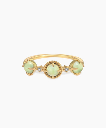 つややかなカボションカットのプレーナイトをゴールドのアームと組み合わせ、上品でシックな佇まいに仕立てたリング。
