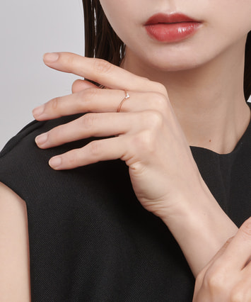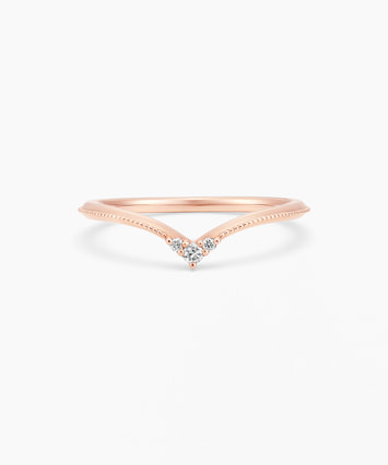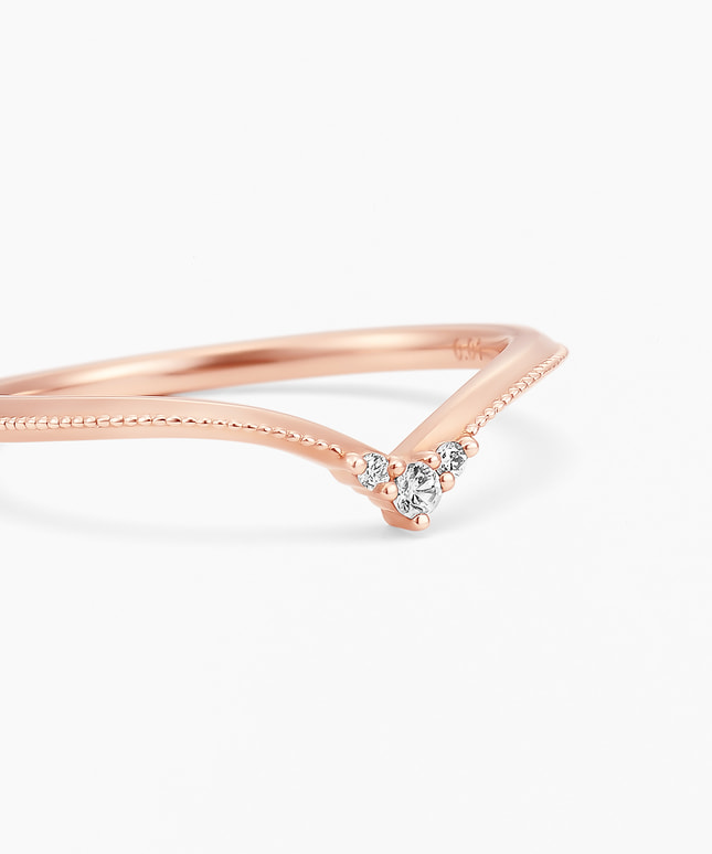 「小さな宝もの」をコンセプトにつくられた、日々にささやかな輝きを添えるシリーズ。「過去・現在・未来」の意味が込められた3石のダイヤモンドに加え、「永遠」を意味するミルグレインをあしらったリング。繊細なミルグレインがクラシカルな雰囲気を感じさせます。控えめな幅感は華美になりすぎず、オフィスシーンにもカジュアルスタイルにもぴったり。V字のラインが指をほっそり長く見せてくれるのも魅力です。