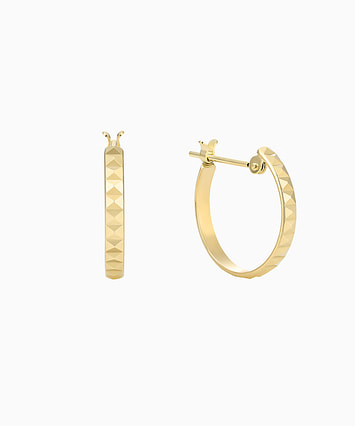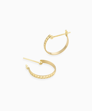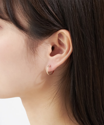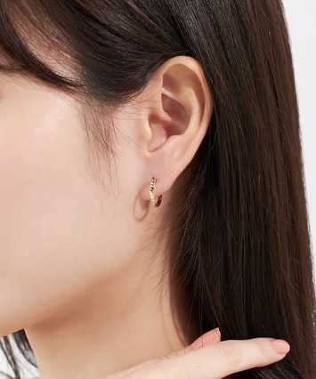 細やかな凹凸が連なるピラミッドカットが、多彩な輝きを生むフープピアス。角度によってシャープに光を反射し、凛とした存在感を耳元に添えます。イエローゴールドの深みある艶が、上品な印象を引き立てます。モダンなスタイルにも映える、洗練されたフープピアスです。■フープピアスのラインナップはこちら■様々なタイプのキャッチをご用意しております。ラインナップはこちら※全国のフェスタリア系列店舗にてクリーニングやアフターメンテナンスを承ります。