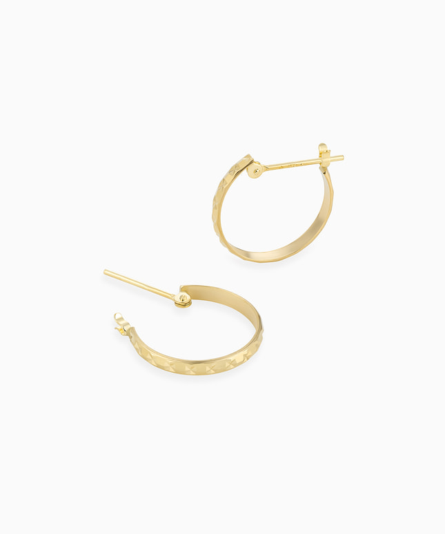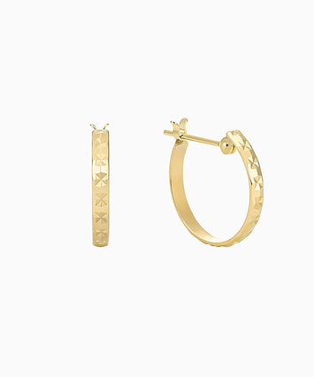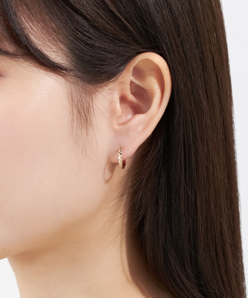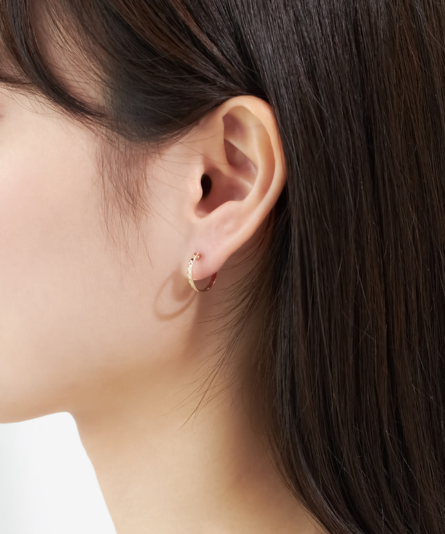 細やかな凹凸が連なるクロスカットを施したフープピアス。光の当たり方でふんわりと輝き、柔らかな印象を耳元に添えてくれます。イエローゴールドの質感が、その繊細さに上質感を添えます。日常使いはもちろん、さりげない華やかさを演出したい日にもおすすめです。■フープピアスのラインナップはこちら■様々なタイプのキャッチをご用意しております。ラインナップはこちら※全国のフェスタリア系列店舗にてクリーニングやアフターメンテナンスを承ります。