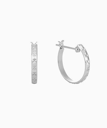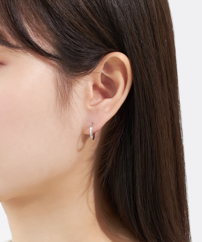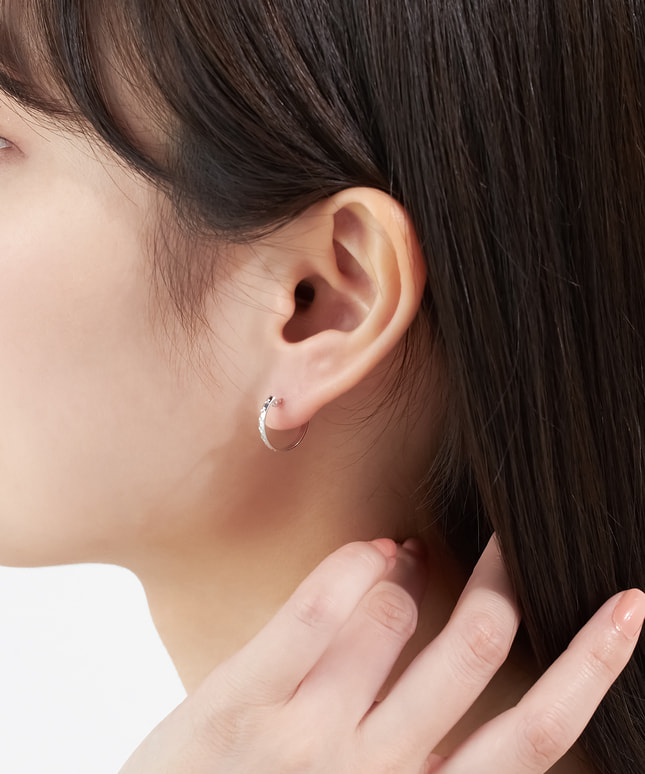 細やかな凹凸が連なるクロスカットを施したフープピアス。光の当たり方でふんわりと輝き、柔らかな印象を耳元に添えてくれます。ホワイトゴールドの質感が、その繊細さに上質感を添えます。日常使いはもちろん、さりげない華やかさを演出したい日にもおすすめです。■フープピアスのラインナップはこちら■様々なタイプのキャッチをご用意しております。ラインナップはこちら※全国のフェスタリア系列店舗にてクリーニングやアフターメンテナンスを承ります。