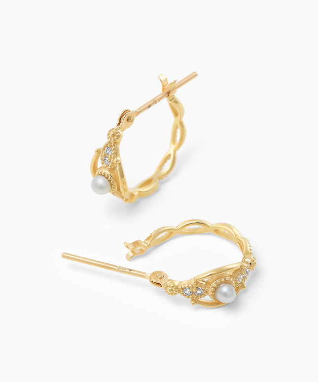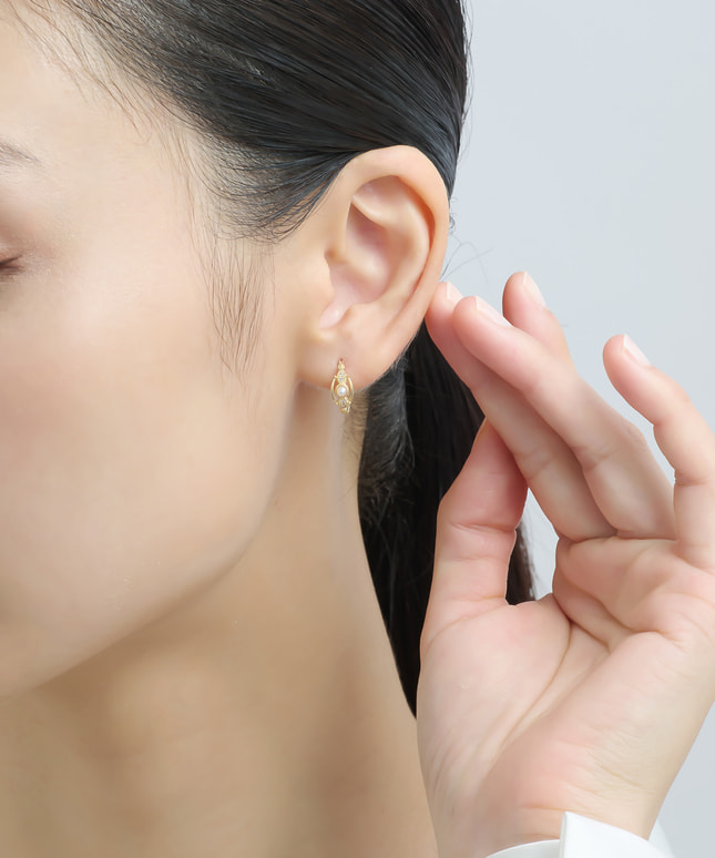 繊細なミル打ちが施されたフープに、淡水パールを包み込むようにあしらった上品なピアス。優しく上品な艶めきが、耳元に清楚な印象と華やぎをもたらします。優美な曲線と小さな粒の装飾が光を優しく反射し、動くたびに耳元で上質な輝きを演出。シンプルな中にもクラシカルな存在感を持ち、日常から特別なシーンまで寄り添うデザインです。■フープピアスのラインナップはこちら■様々なタイプのキャッチをご用意しております。ラインナップはこちら※全国のフェスタリア系列店舗にてクリーニングやアフターメンテナンスを承ります。