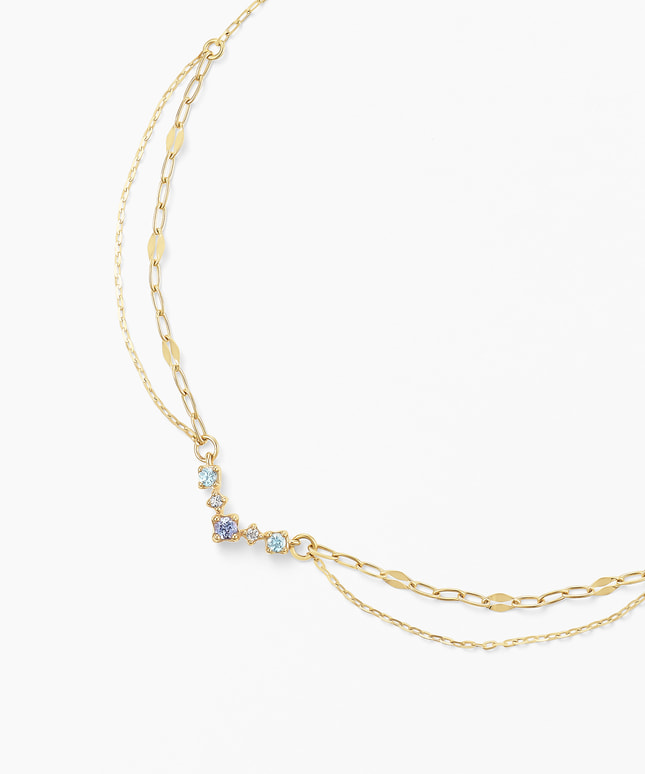 優しいブルーのグラデーションカラーであしらった二連デザインのブレスレット。繊細なチェーンとペタルチェーンで一本で重ね着けをしているようなリュクスな印象を演出。透明感のあるブルーグラデーションが手首の角度によって光のニュアンスが変化し肌の上で清らかに溶け込みます。トパーズ・タンザナイト・ジルコンと11月・12月の誕生石を含むため、記念日の贈り物にもおすすめ。淡くてさわやかな色合いでお持ちのジュエリーとのコーディネートやスタイルを問わずお使いいただけます。■同シリーズのアイテムはこちら■長さの調節ができるアジャスターはこちら※天然石を使用しているため、ストーンの色合いは一つ一つ異なる場合がございます。※全国のフェスタリア系列店舗にてクリーニングやアフターメンテナンスを承ります。