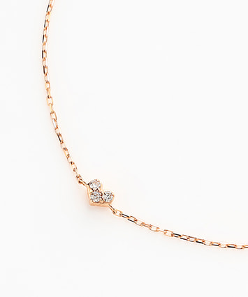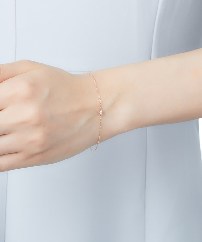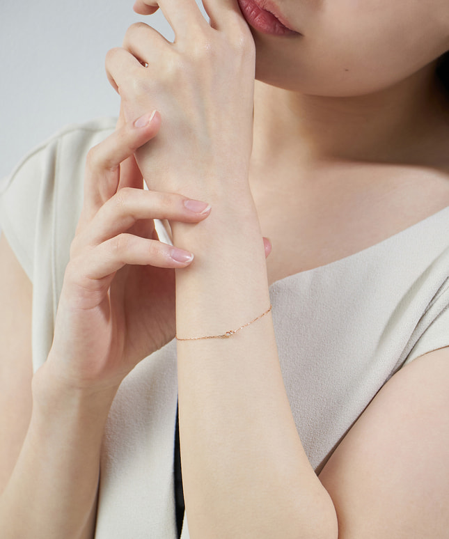 光を受けてキラキラと輝くK10ピンクゴールドのチェーンとダイヤモンドが、華奢なシルエットながらも存在感を放つブレスレット。