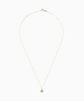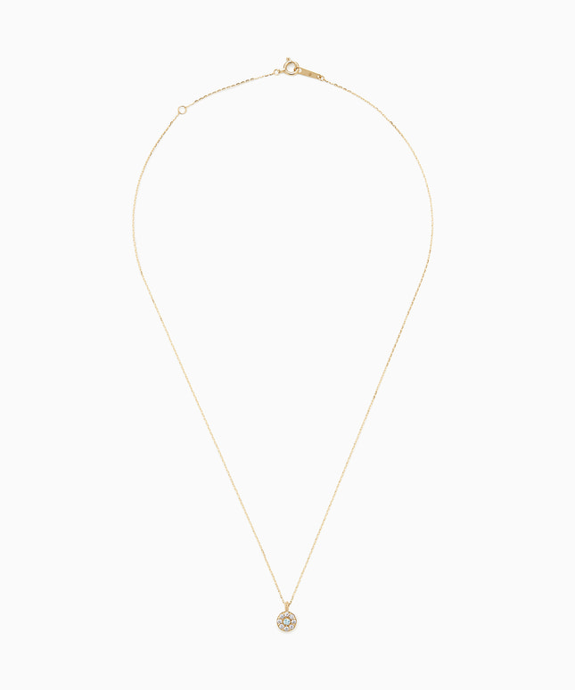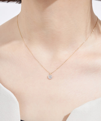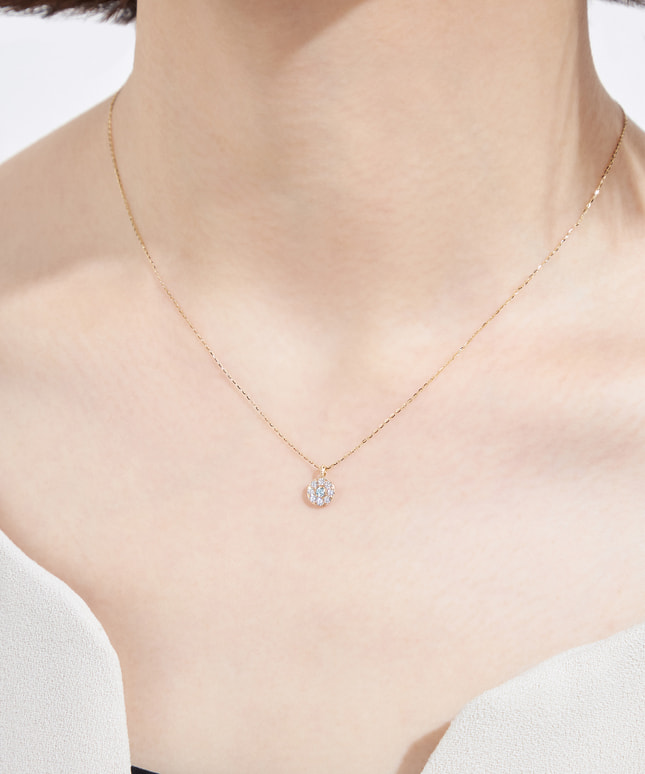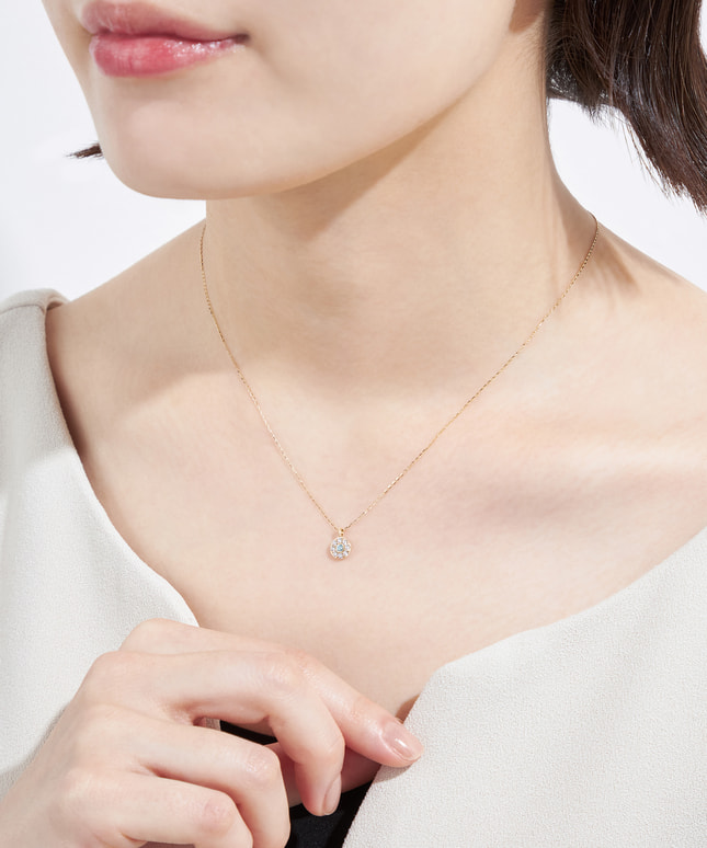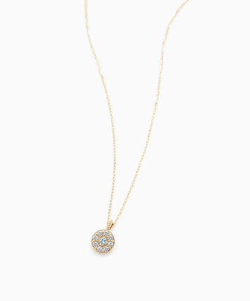 センターのアクアマリンを包み込むようにキュービックジルコニアがセッティングされた華やかなデザインのネックレス。