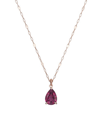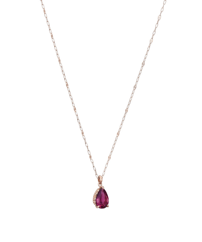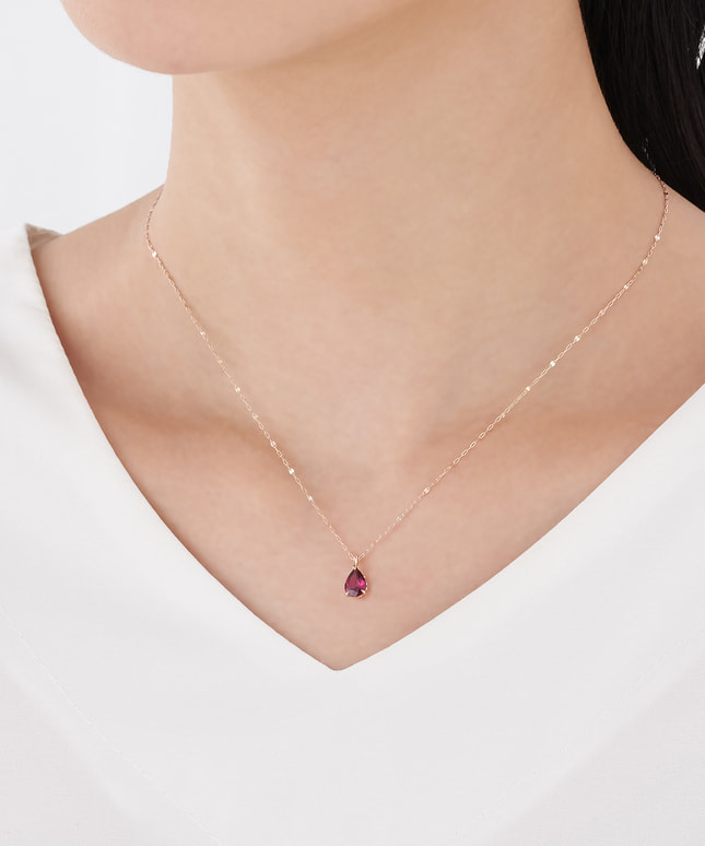 こっくりとしたボルドーカラーが視線を惹きつけるロードライトガーネットを主役にしたネックレスは、石を留める石座にミルグレインを施すことでよりクラシカルな印象に。