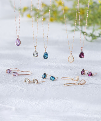自然からこぼれ落ちた色とりどりのひと雫をクラシカルな印象のネックレスとピアスに仕立てたシリーズ。