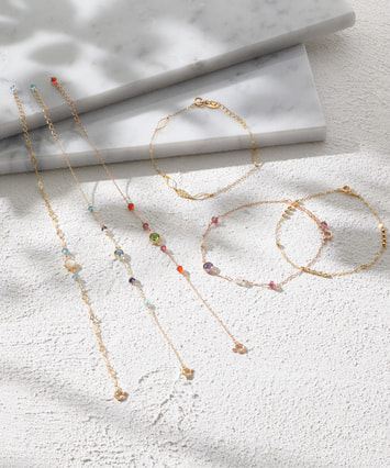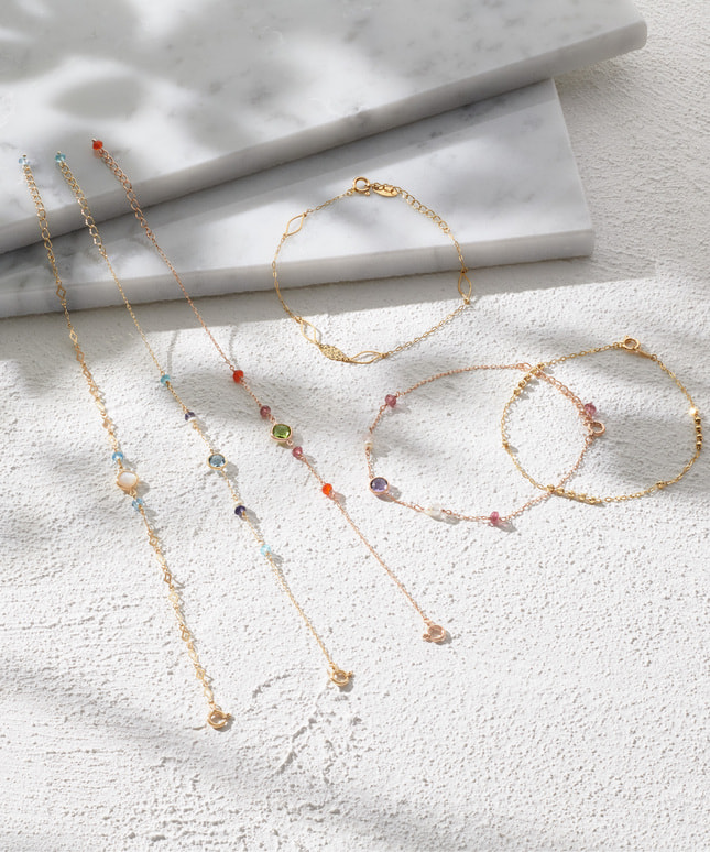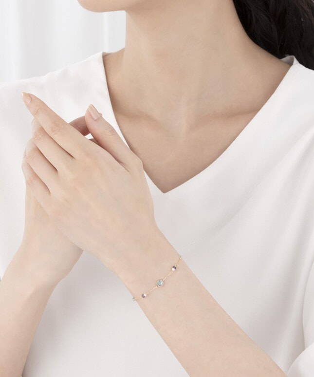 繊細なゴールドチェーンに、さわやかな輝きを放つカラーストーンをあしらったブレスレット。さまざまな色味のブルーカラーのストーンが、まるで水辺のような清らかな雰囲気を纏います。エンドパーツにセッティングされたブルートパーズは、どの角度から見ても手元を美しく彩ってくれます。3cmのアジャスターが付いているため、ご自身の手元や装いに合わせて長さを調整できるのも嬉しいポイントです。■ブレスレット特集はこちら■長さの調節ができるアジャスターはこちら※天然石を使用しているため、ストーンの色や柄は一つ一つ異なる場合がございます。※全国のフェスタリア系列店舗にてクリーニングやアフターメンテナンスを承ります。