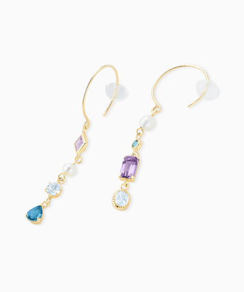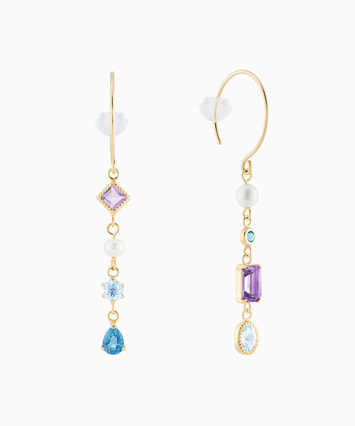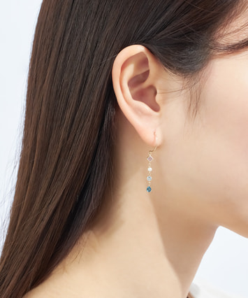 洋服をクローゼットから選ぶように、その日の気分や装いに合わせてイヤーアイテムを選ぶ…そんな楽しみが詰まったシリーズです。カット・カラーの異なるストーンをランダムに配置した、フックタイプのピアス。柔らかな色合いのカラーストーンと淡水パールが上品な雰囲気を漂わせつつ、アシンメトリーなデザインで遊び心もプラス。左右で目を惹くカラーが違うので、両耳セットで身に着けるのはもちろん、他のピアスやイヤーカフとコーディネートして、片方ずつでもお楽しみいただけます。※天然石を使用しているため、ストーンの色や柄は一つ一つ異なる場合がございます。■様々なタイプのキャッチをご用意しております。ラインナップはこちら※全国のフェスタリア系列店舗にてクリーニングやアフターメンテナンスを承ります。#揺れるピアス #フックピアス #11月誕生石 ブルートパーズ #2月誕生石 アメシスト #淡水パール #アシンメトリーピアス