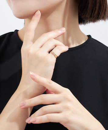 自分らしさをリングに込め、日々を楽しむ人のためのピンキーリングシリーズ。アシンメトリーなラインが遊び心のあるデザインは、幅の広い方を手の外側にして着けると指を長く見せてくれる効果がアップします。お守りジュエリーとして人気の高いピンキーリングは、願い事を成就させたいときは左手に、好感度をUPさせたいときは右手に着けるとGOOD。1本でも満足感がありながら、繊細でシンプルなデザインなので、お持ちのジュエリーと合わせてファッションのバリエーションを広げてくれるアイテムです。