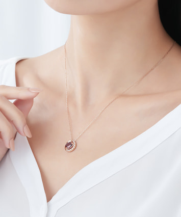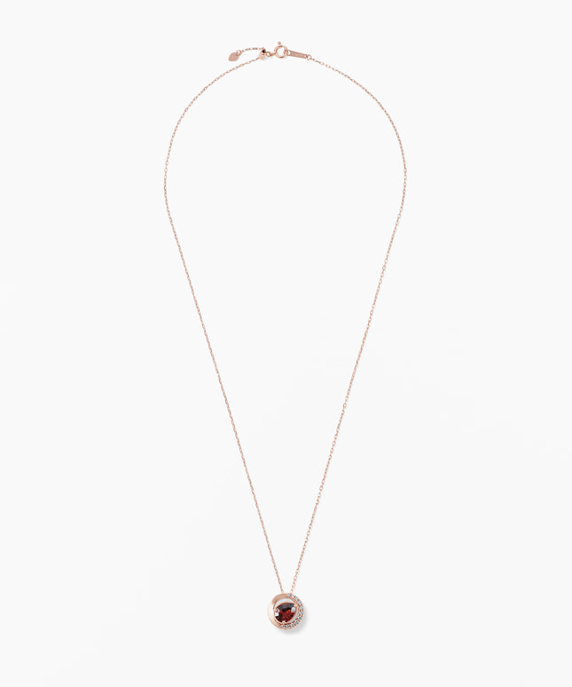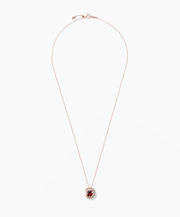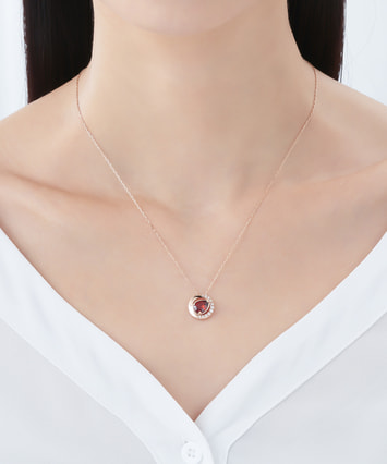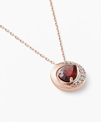 ガーネットの凛とした色彩とダイヤモンドの瑞々しいきらめきが、胸元に彩りとアクセントをプラスします。