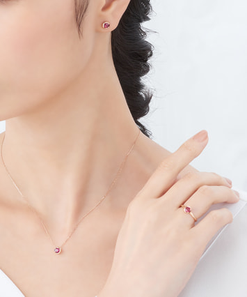 「月の満ち欠け」を表現したシリーズ。それぞれの誕生石を1石シンプルに。石の左側と右側で異なる留め方をしており、あらゆる角度からみて美しいデザインです。情熱的で華やかな赤色が印象的なルビーは、7月の誕生石であるとともに、女性のお守り石とも言われます。血液の赤を思わせる色合いから生命の力を持つとされ、前へ進む情熱や勇気をサポートしてくれると考えられているルビー。ご自身へのご褒美や大切な方へのプレゼントにもおすすめのアイテムです。ルビーの石言葉:「情熱」「愛情」「威厳」「勇気」■同シリーズのアイテムはこちら→リング、ピアス■様々なタイプのキャッチをご用意しております。ラインナップはこちら※全国のフェスタリア系列店舗にてクリーニングやアフターメンテナンスを承ります。