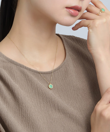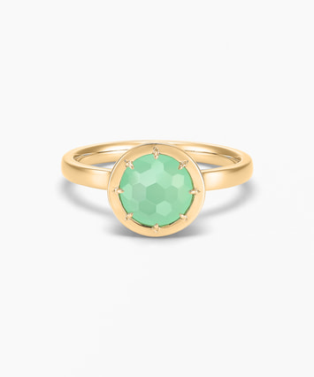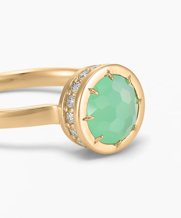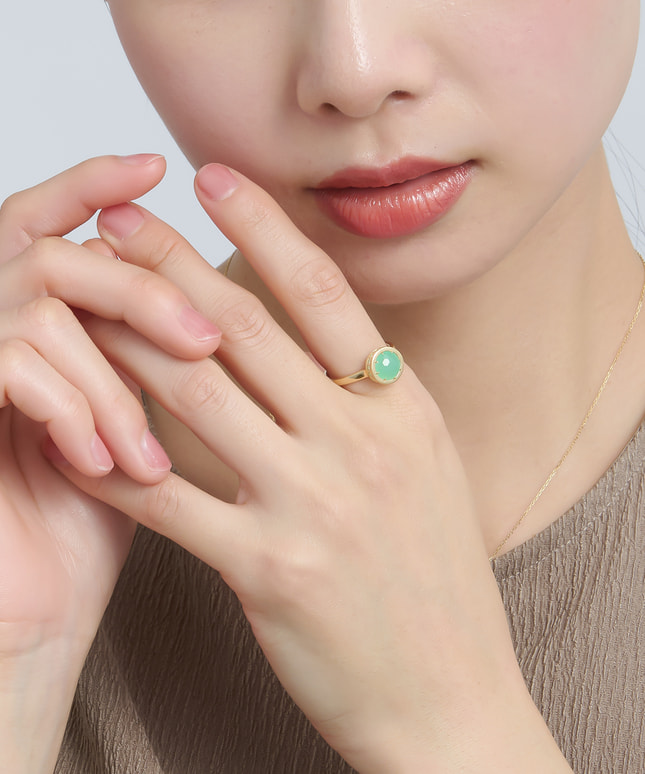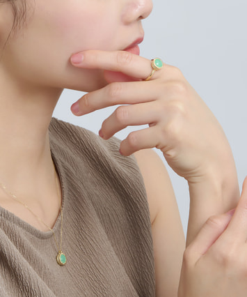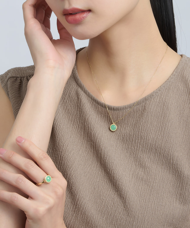 ■デザインについて たくさんの人が集まる宴のポジティブなエネルギーをイメージして創られたリングです。 大切な人とのつながりで生まれる温かさや始まりや区切りを祝う身の引き締まる気持ちをいつも心に、という想いを込めました。 シンプルなデザインながらも、側面には地金の色に合わせた16個のダイヤモンドをあしらい、華やかさを演出。 メインストーンのクリソプレーズは、才能を開花させ目標達成や成功、強運をもたらす石と言われています。 フレッシュで鮮やかな緑色が特徴のクリソブレーズが、胸元をパッと華やかな印象に。 ■スタッフのおすすめポイント ・クリソプレーズは、夢や希望を叶える力があるとされており、お守りジュエリーとしてもおすすめです。 ・正面は穏やかな印象、斜めから見ると華やかさが引き立ち、角度によって表情が変わるデザイン。 ・同じシリーズのネックレスともコーディネートを楽しむことができます。 ■カラー・素材の展開 メインストーンは8種類を展開。 こちらのクリソプレーズの枠と地金には14Kのイエローゴールドを使用しています。 ■同シリーズのアイテムはこちら